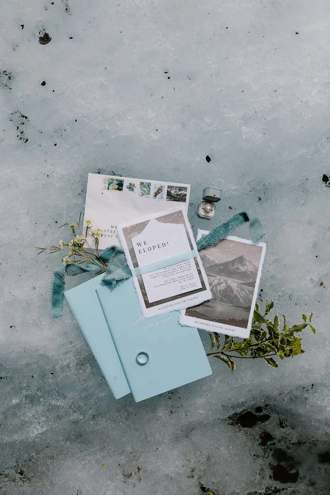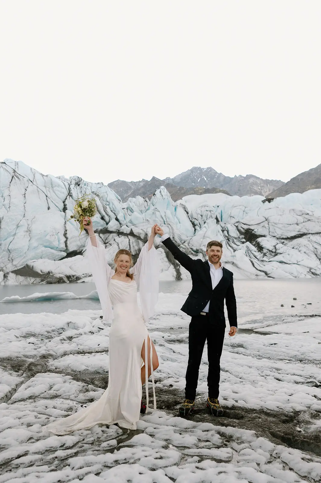 The dress, suit and florals were all super simple. The dress was picked because of the sleeves and how it would look against the glacier — simple but still dramatic and gorgeous. The suit was intentional to match the blue of the glacier. Everything was designed so the landscape could stay front and center. Neutral tones, organic florals, and layered textures were chosen to complement the ice and mountain surroundings rather than compete with them.
