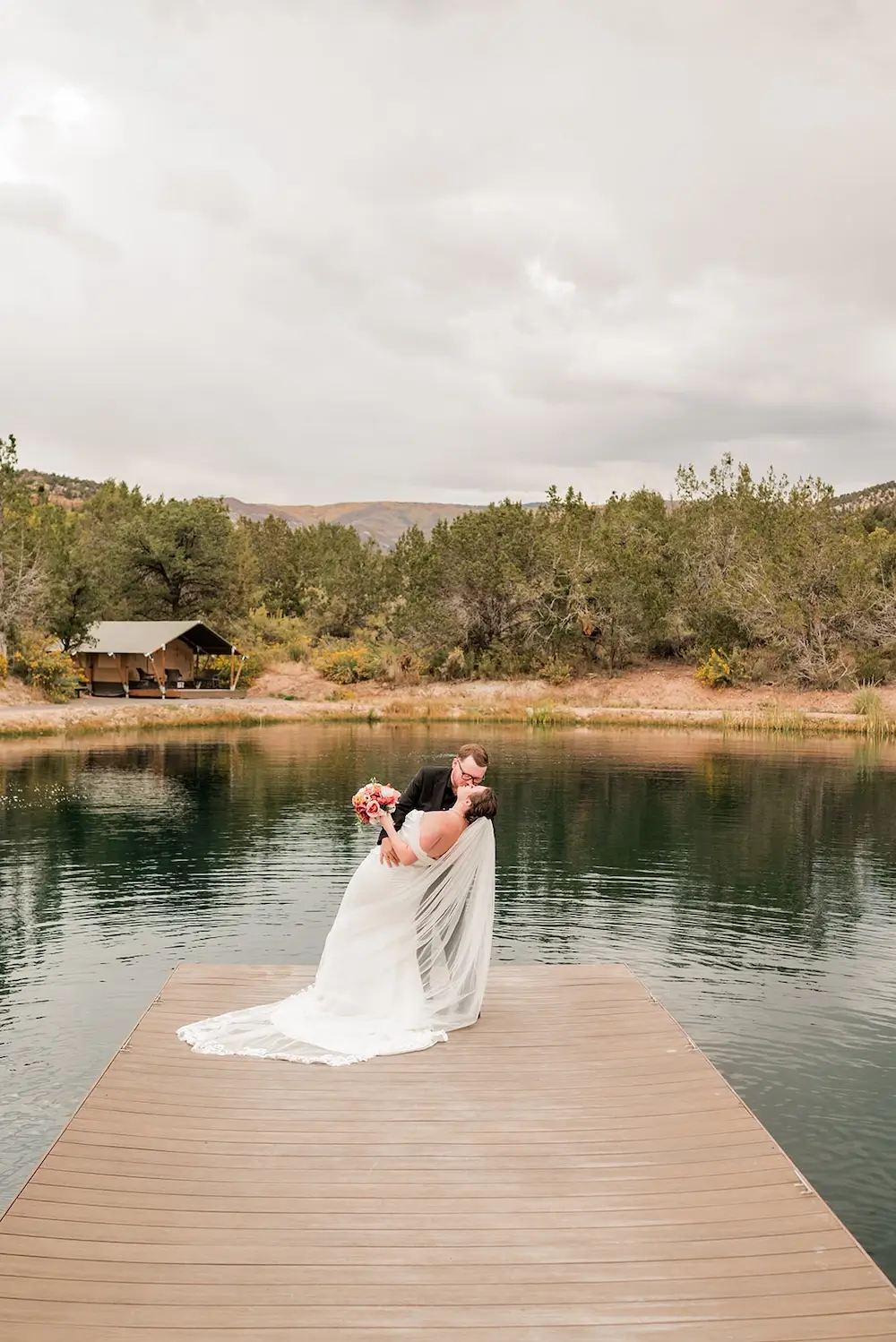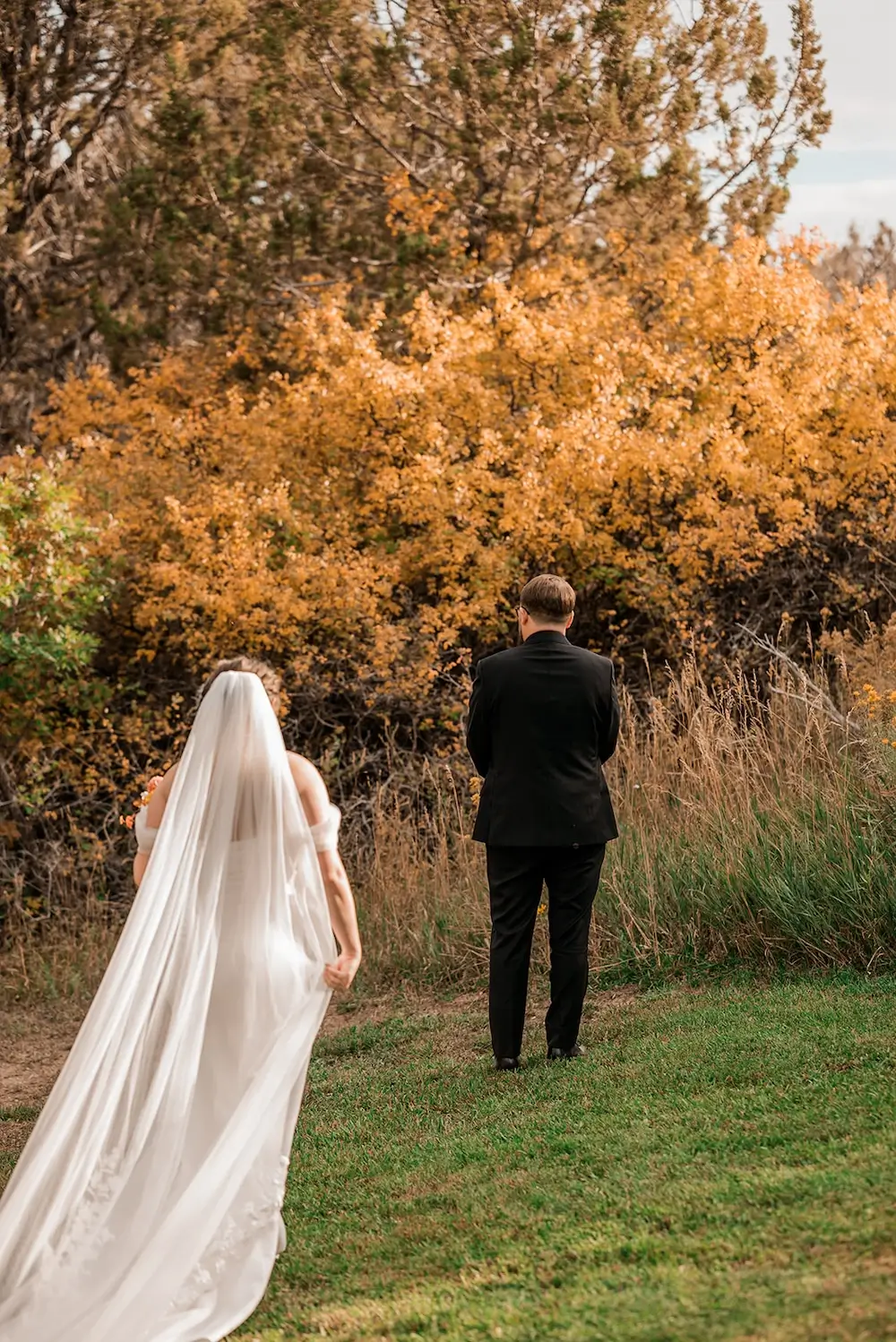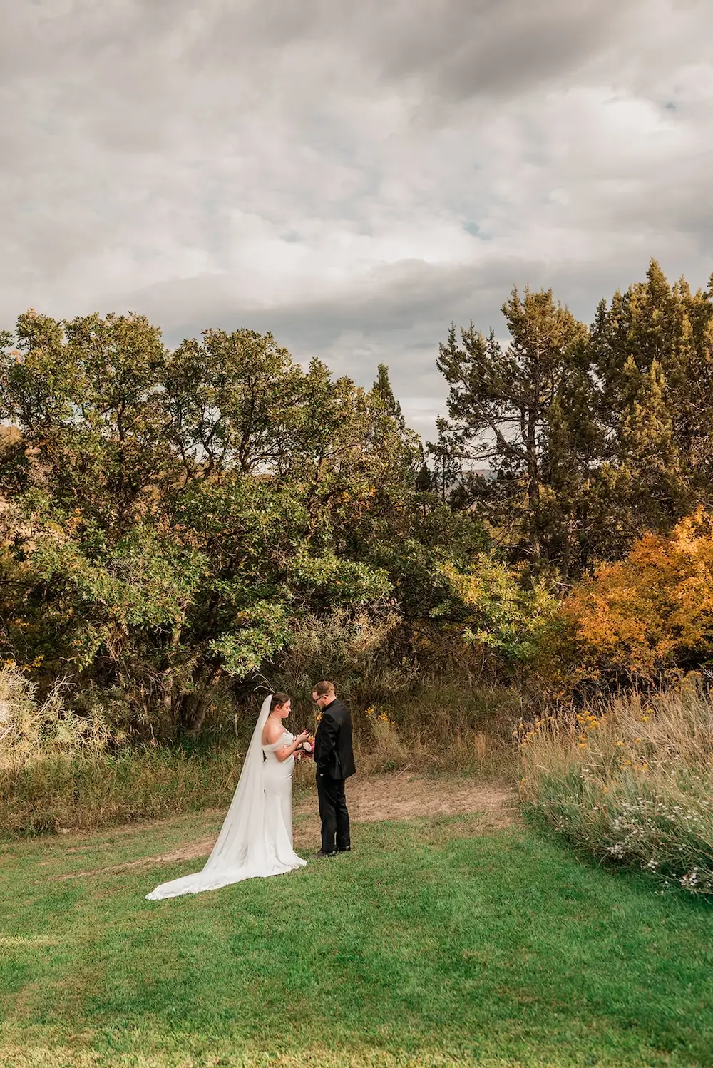 The ceremony took place at an overlook at Camp7, with the Grand Mesa and its fall foliage stretching out behind them. Surrounded by their small group of guests, the couple stood together in a setting that perfectly matched the cozy, whimsical vision they had imagined.