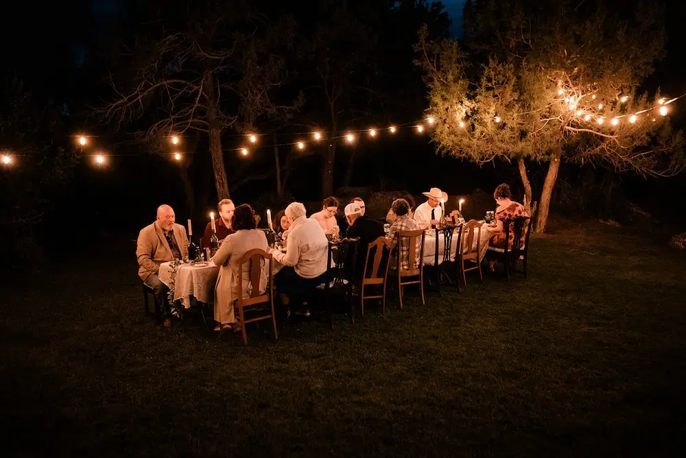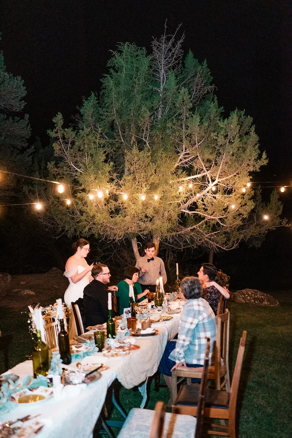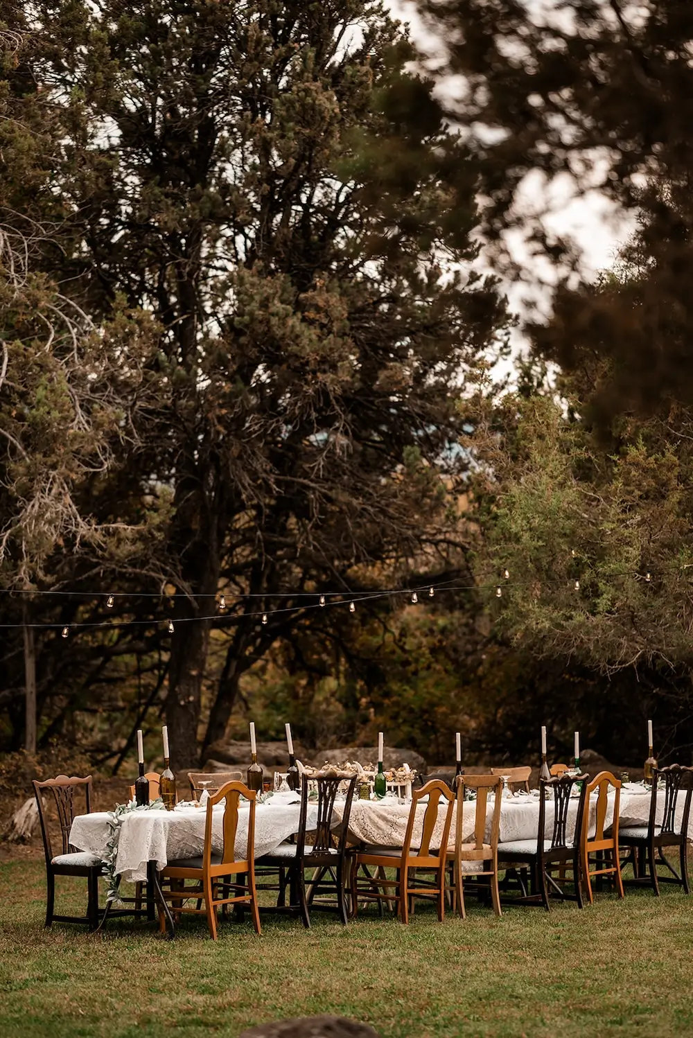 After the ceremony, everyone gathered on the lawn outside the cabin for the reception. Twinkle lights, candles, and thoughtfully curated décor created the feeling of a cozy forest dinner party.