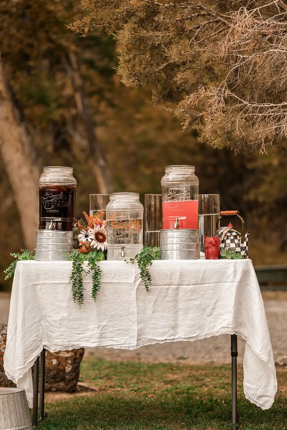 The couple leaned into a natural, earthy fall color palette, and the table settings reflected their vintage, eclectic style. Much of the décor and reception setup was DIY, borrowed, or thrifted, adding to the relaxed and personal atmosphere.